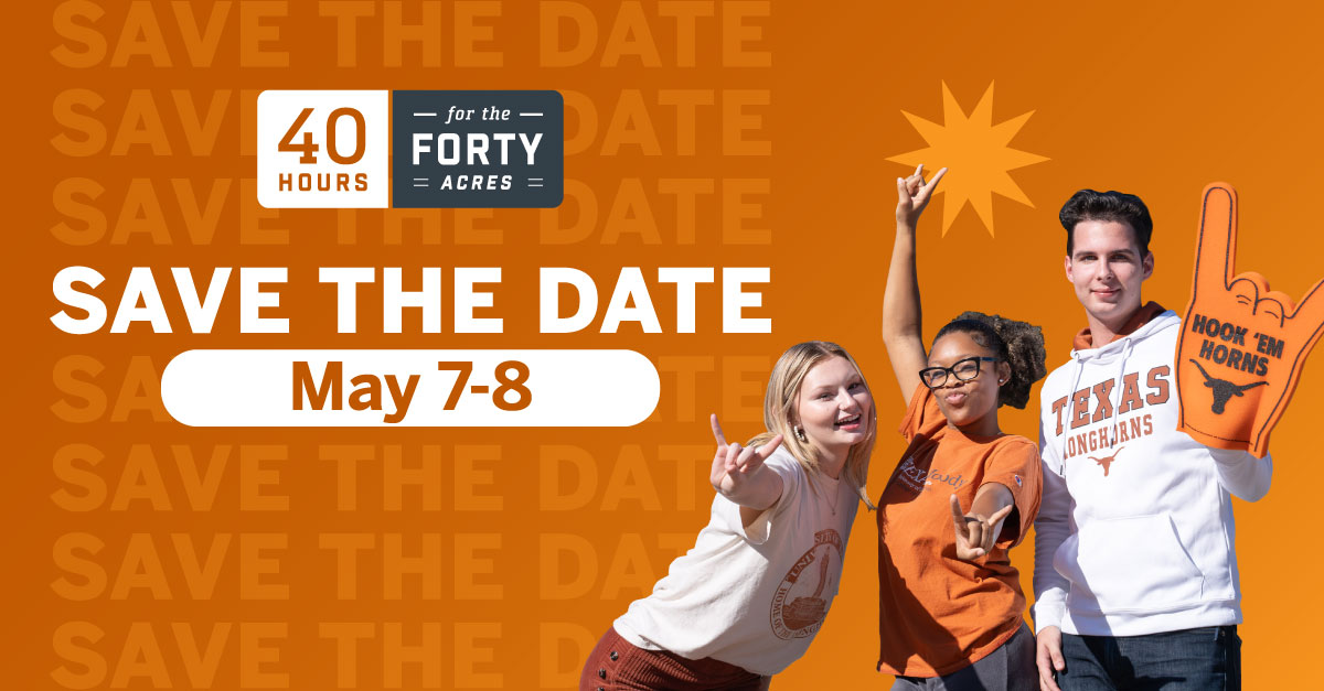 https://give.utexas.edu/40-hours-for-the-forty-acres/?a=10361353 The University of Texas at Austin’s annual day of giving, 40 Hours for the Forty Acres, starts tomorrow at 6 a.m. Central. Your gift, big or small, helps support the people, places, and programs that connect you to UT. Over the 40 ...Read more